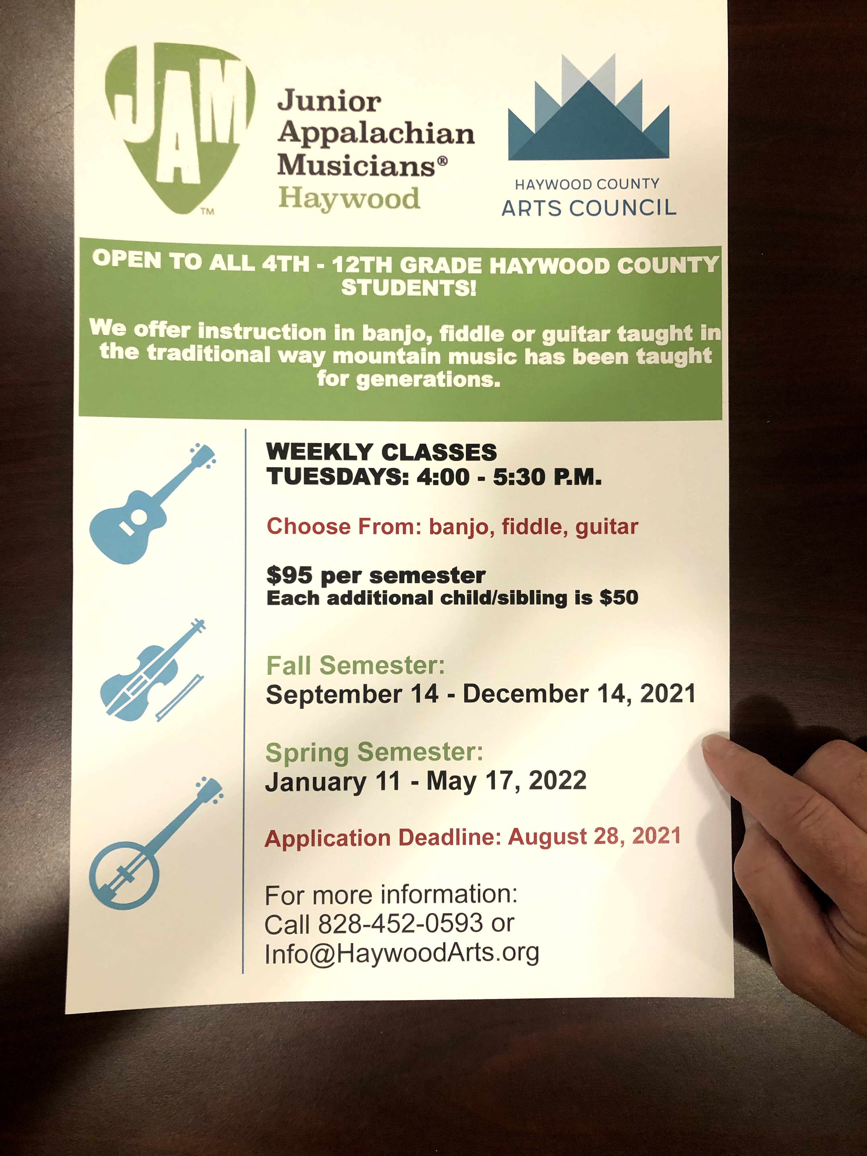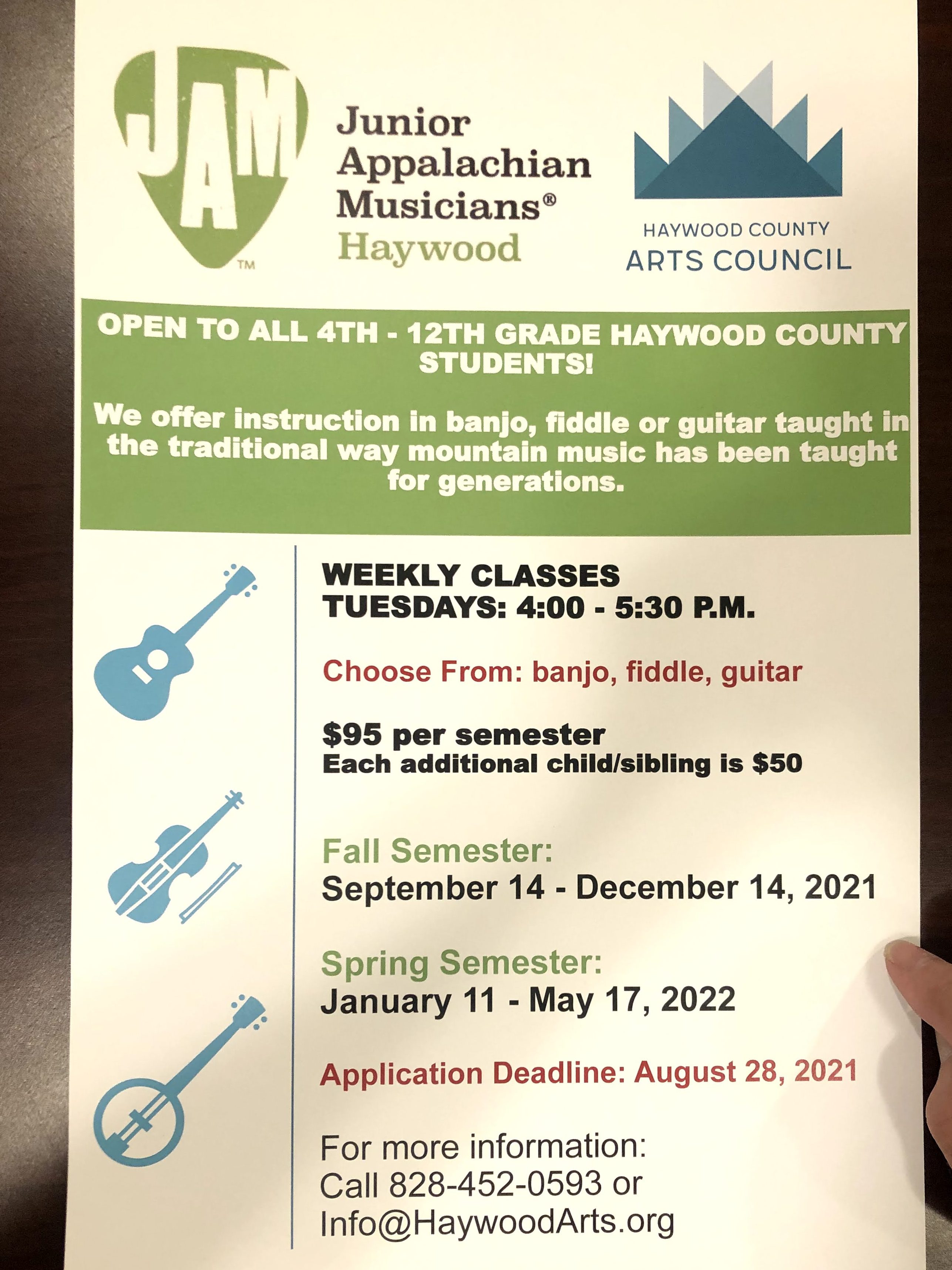 Haywood County Jam will be hosting an Open House for students interested in signing up to learn fiddle, banjo, or guitar on Tuesday August 31 from 4-4:30 at the Folkmoot Center in Waynesville, NC. Teachers are Travis Stuart, Robby Robertson, Maddy Mullany, and Cary Fridley. For more information, please contact the Haywood County Arts Council.