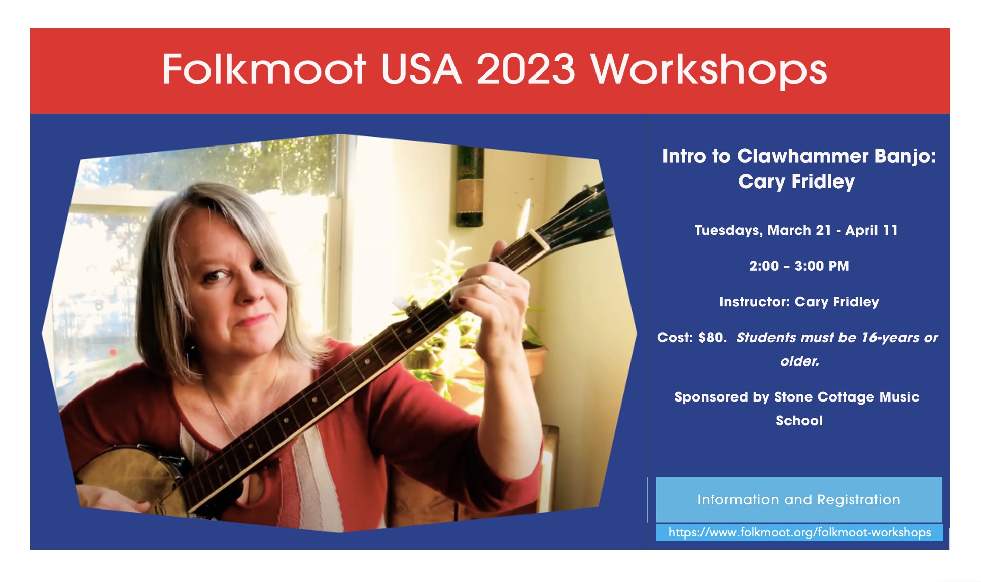 Description: Learn the basics of beginning old-time Appalachian clawhammer style banjo: tunings, the basic stroke or “bum-diddy,” how to play a melody, beginner exercises, 2-3 tunes, and an introduction to the drop thumb technique. Students must have their own banjo in good working condition.