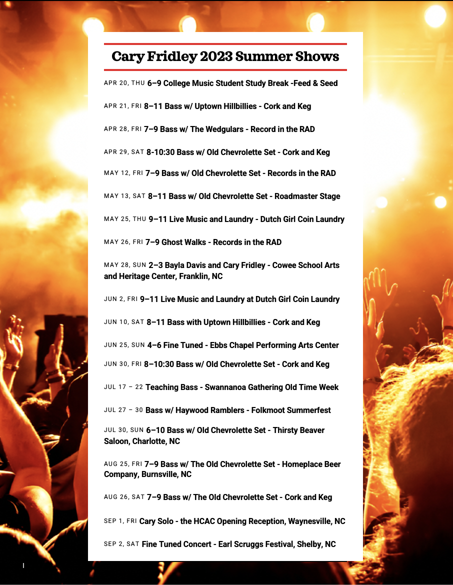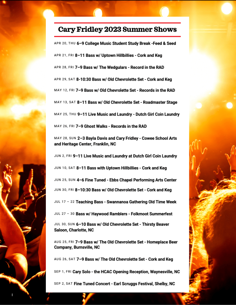 Cary and Bayla play old-time music with harmony vocals, ranging from fast barnburners to soulful ballads, with banjo, guitar, and some fiddle. Cary has been playing and singing around WNC for 25 years, and Bayla is an award winning 16 year-old rising banjo star from Leicester, NC, who has been featured at IBMA, Merlefest, played with Bela Fleck, and won 1st place at the Galax Fiddlers Convention this past summer. Cary was Bayla’s first teacher through the JAM program in Black Mountain, and the two recently reunited through a Fine Tuned Mentorship that was sponsored by Blue Ridge Music Trails. After a year of recording and playing gigs with Fine Tuned, Cary and Bayla are now booking shows for the new year to continue their musical collaboration. Email caryfridley@gmail.com to book our show at your venue.