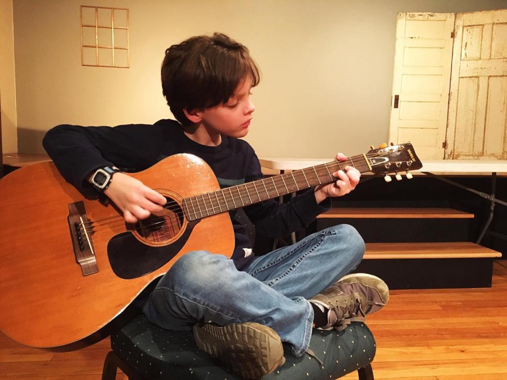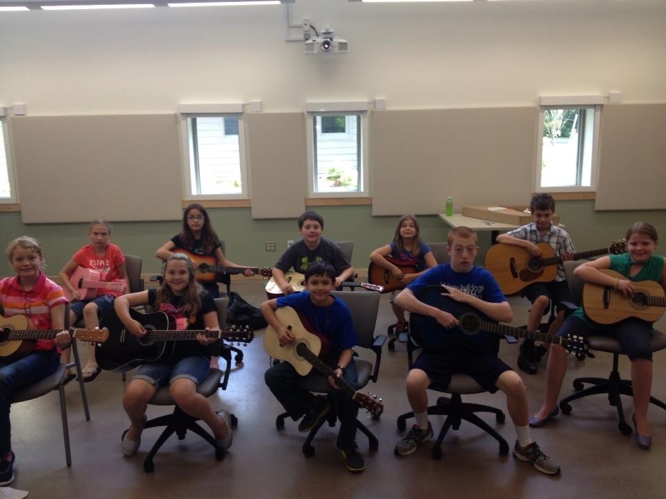 Practicing a D chord in JAM guitar class in Black Mountain, NCJAM Class at Black Mountain Center for the Arts.Guitar Class poses for a picture at Jam Camp.